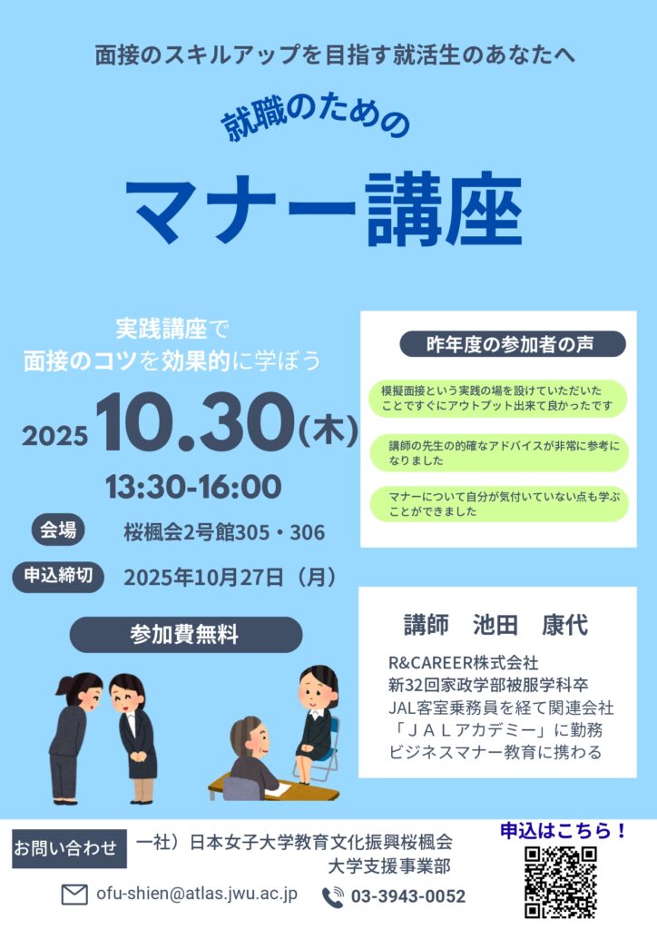 学生向け就職支援/行事・講演会 就職のためのマナー講座開催のお知らせ 10月30日(木) 2025年10月22日 by webmaster 本年度も就職のためのマナー講座を開催します。面接スキルアップを目指す学生の皆様は、ぜひご参加ください。皆様のご参加をお待ちしています。 ■日 時:10月30日(木) 13:30~16:00 ■会 場:桜楓2号館305・306号室 ■講 師:池田 康代氏 (新制32回家政学部被服学科卒) R&CAREER株式会社 ■対 象:日本女子大学学生 ■申込締切:10月27日(月) 申込はこちらから