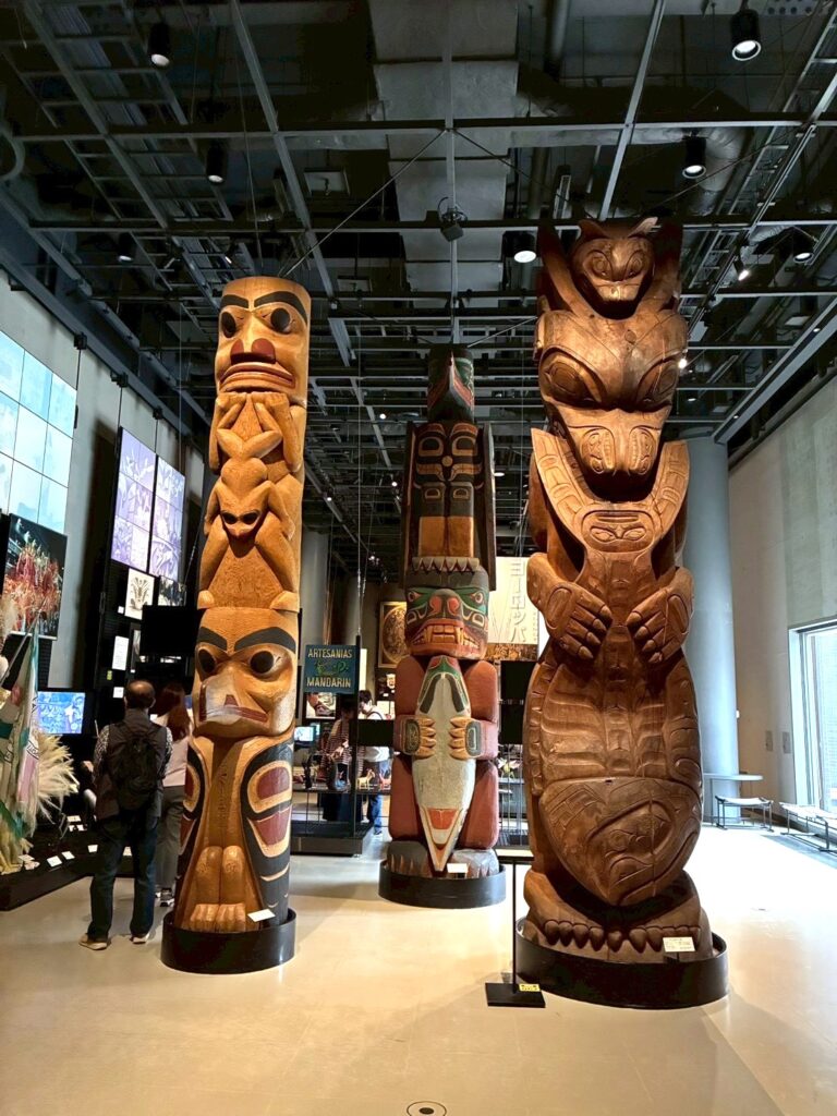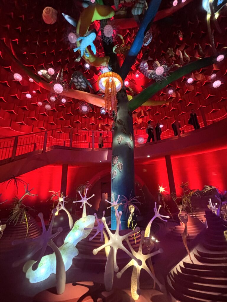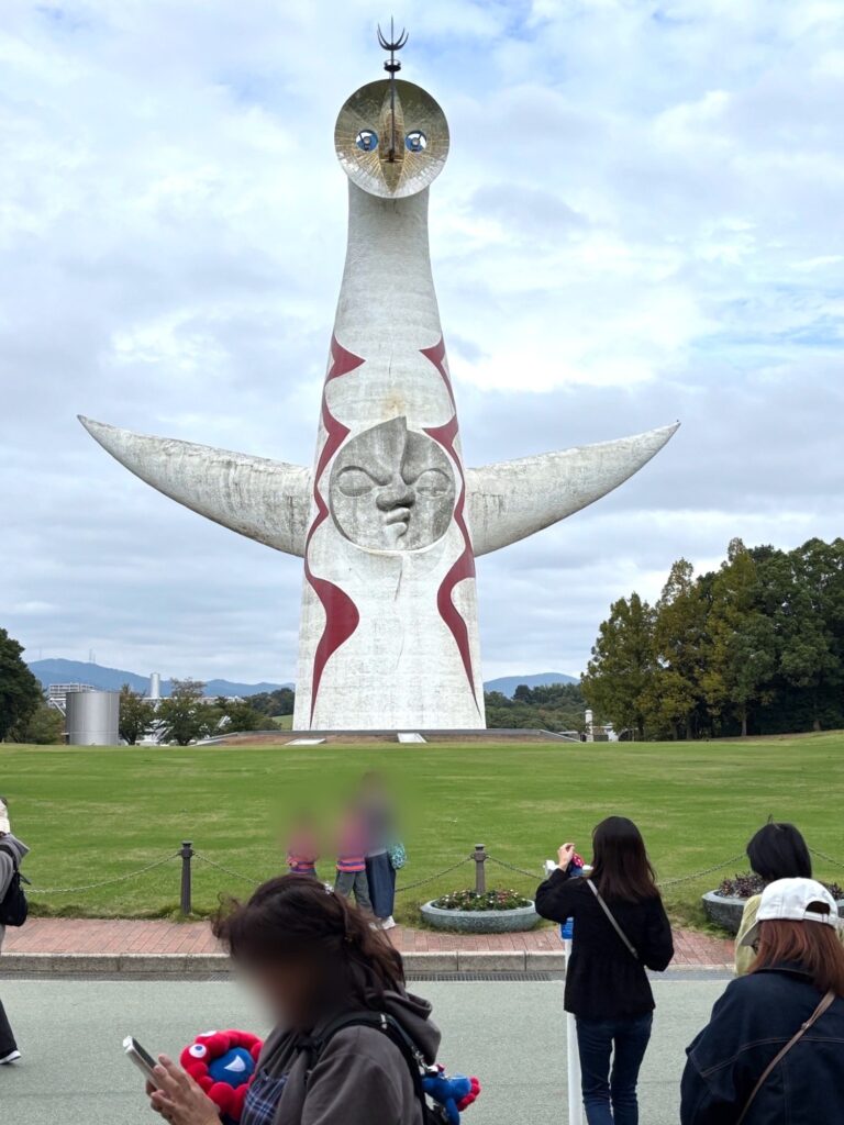一休みした後は、太陽の塔の見学をしました。太陽の塔の内部には「生命の樹」という巨大なオブジェがそびえていて、原始の生命から人間までの進化の過程が立体的に表現されています。照明と音の演出で、生き物たちが動き出しそうな臨場感があります。外部のインパクトだけでなく、内部空間にも岡本太郎の思想が詰まっていて、強烈なエネルギーを感じました。
