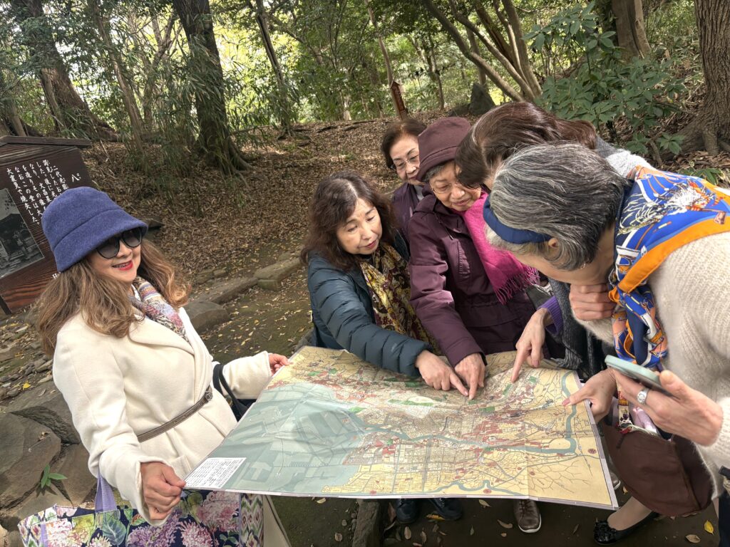 特別名勝、特別史跡の国宝級のこの庭園は、寛永6(1629)年に徳川頼房によって竣工された江戸時代の趣を残した日本庭園です。江戸から京へ、京から江戸へ旅する、東海道、中山道それぞれの道のりを巡る回遊式で、築山泉水式庭園。京への道のりは大井川をとおり渡月橋、西湖の堤、清水観音堂跡、通天橋、円月橋をぬけ、梅林へ続きます。途中、江戸時代の古地図を広げると、参加者のお一人、後藤さんの天然寺が記されていて一同感激しました。小石川後楽園も天然寺も400年という長い歴史を刻んでいるのですね。なんとすばらしい。