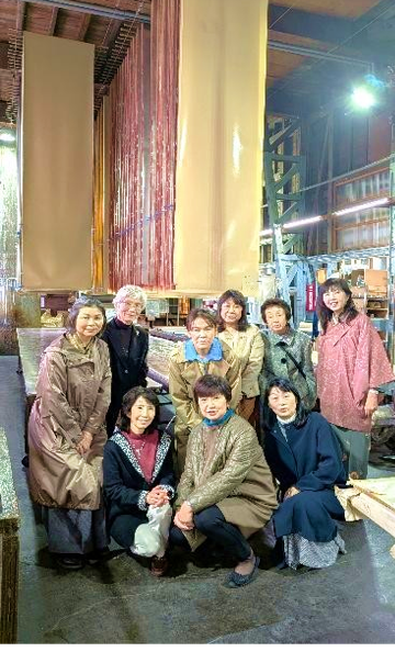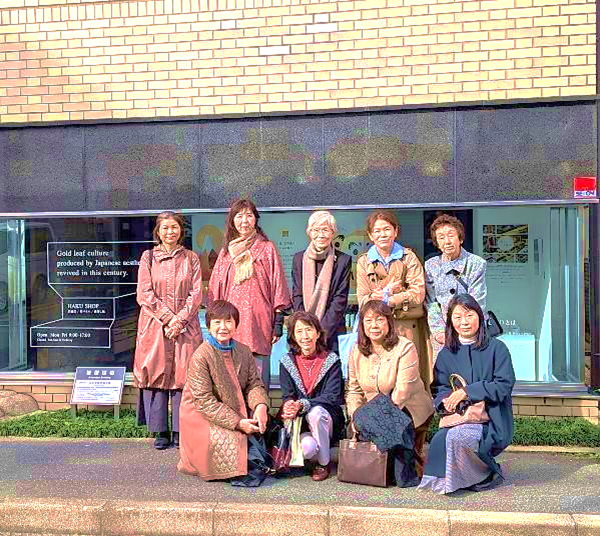 作業場の見学では、金箔(真鍮箔)を貼っておられるところを見せていただきました。長さ 5 メートルもあろうかと思われる接着剤を塗った紙に、20cm四方の金箔を4人がかりで敷き詰め貼りあわせていく様子は静かながら圧巻でした。10,000 分の数ミリという薄さの箔ですから、ちょっと息がかかれば揺らめいたり皺になったりしそうですが、正確に手早く黙々と作業される姿を拝見して、職人の技のすばらしさに感心いたしました。こうしてできた品々が金屏風や壁紙となり、ホテルや神社仏閣の建材、マテアリアルに使われたり、また小物に変身したりして、私たちの生活を彩るのだと知りました。