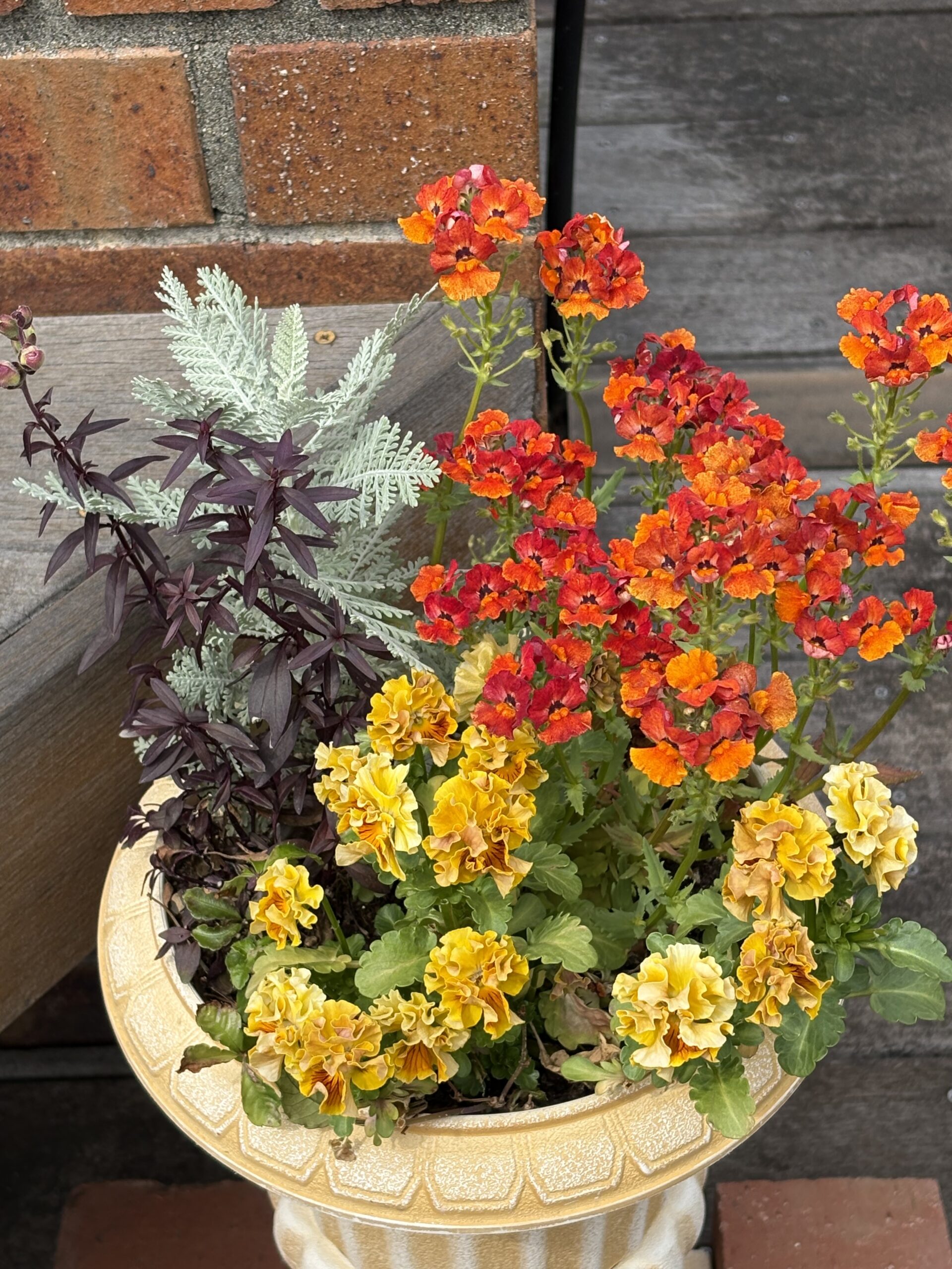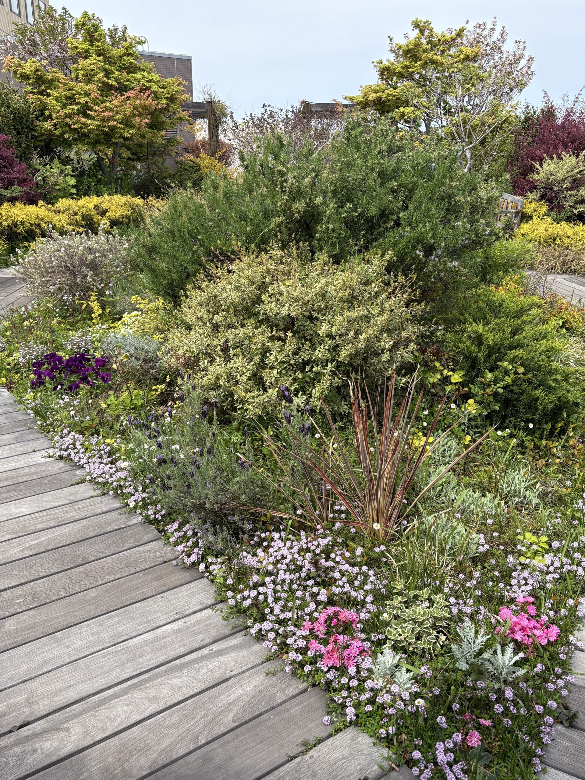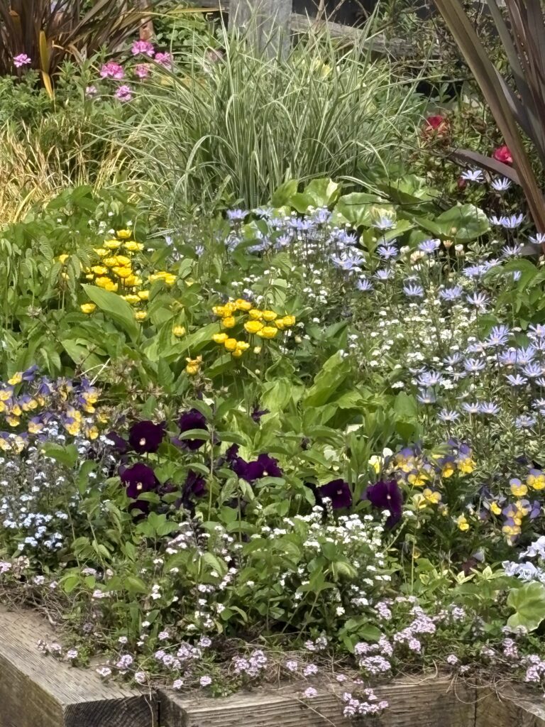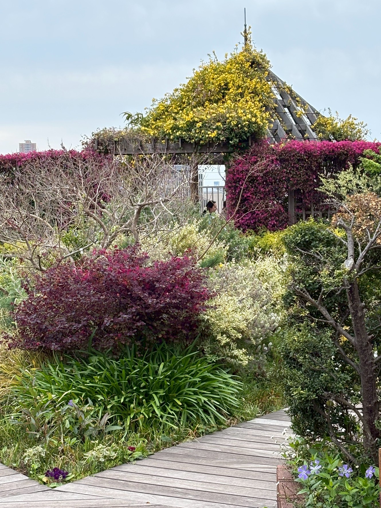 屋上に上がった正面、野原のエリアは正に春の野原のような小花の饗宴。卒業生達へのお祝いとして、昨年「卒50周年」を迎えた同窓生からの贈り物。